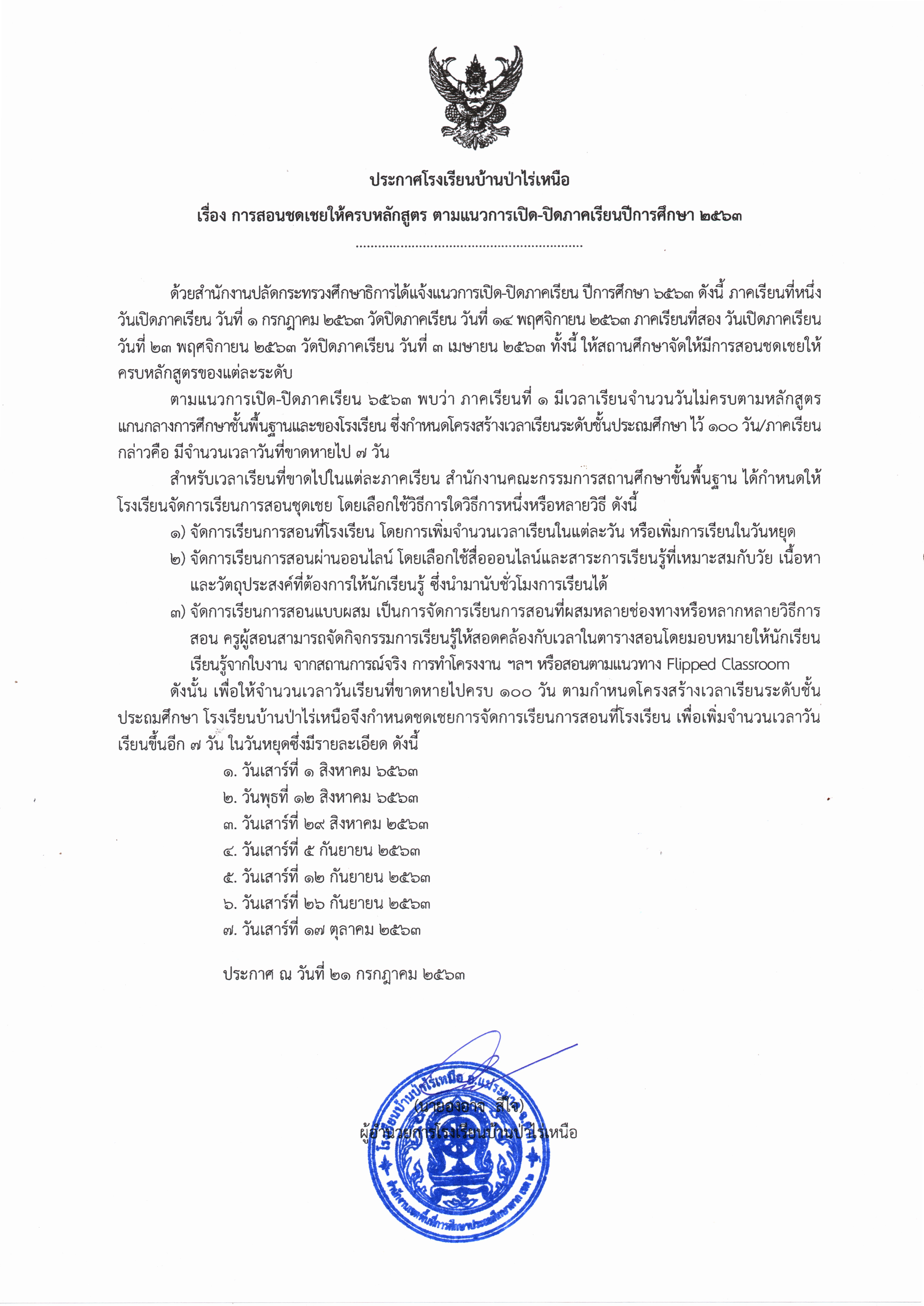 ประกาศ เรื่องการสอนชดเชยให้ครบหลักสูตร ตามแนวการเปิด-ปิดภาคเรียนปีการศึกษา 2563