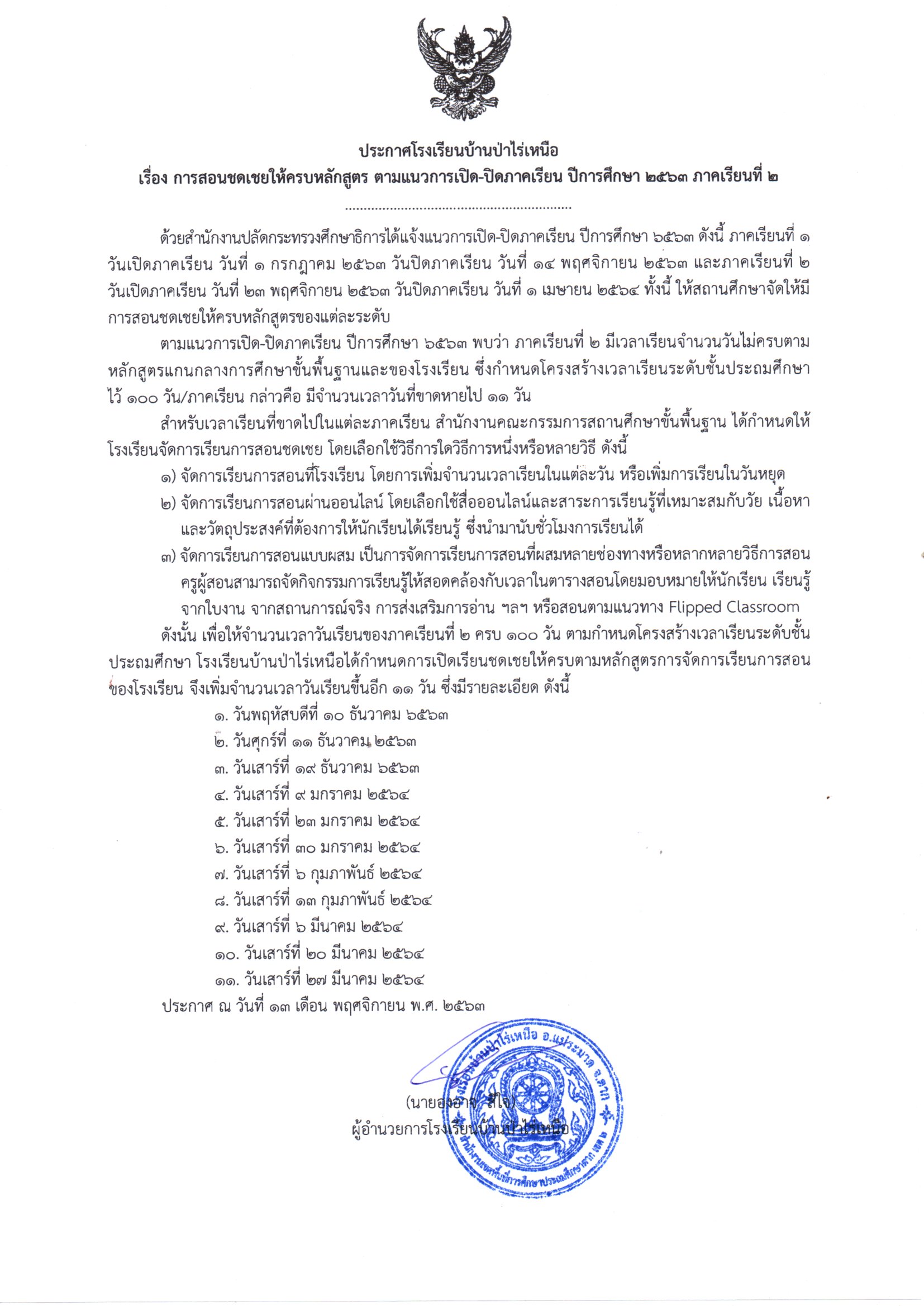 ประกาศ เรื่องการสอนชดเชยให้ครบหลักสูตร ตามแนวการเปิด-ปิดภาคเรียนปีการศึกษา 2563 ภาคเรียนที่ 2