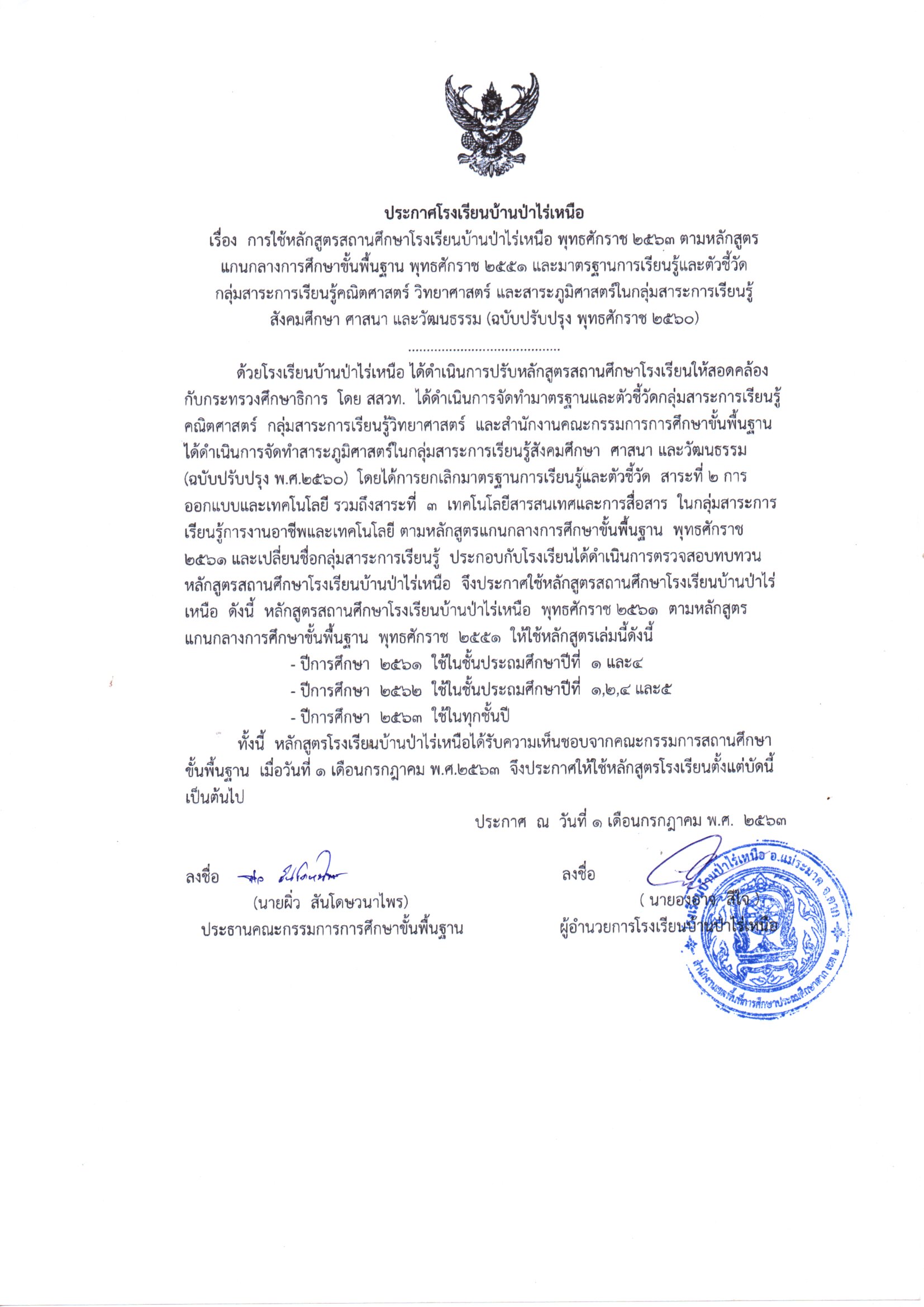 การใช้หลักสูตรสถานศึกษาโรงเรียนบ้านป่าไร่เหนือ พุทธศักราช 2563