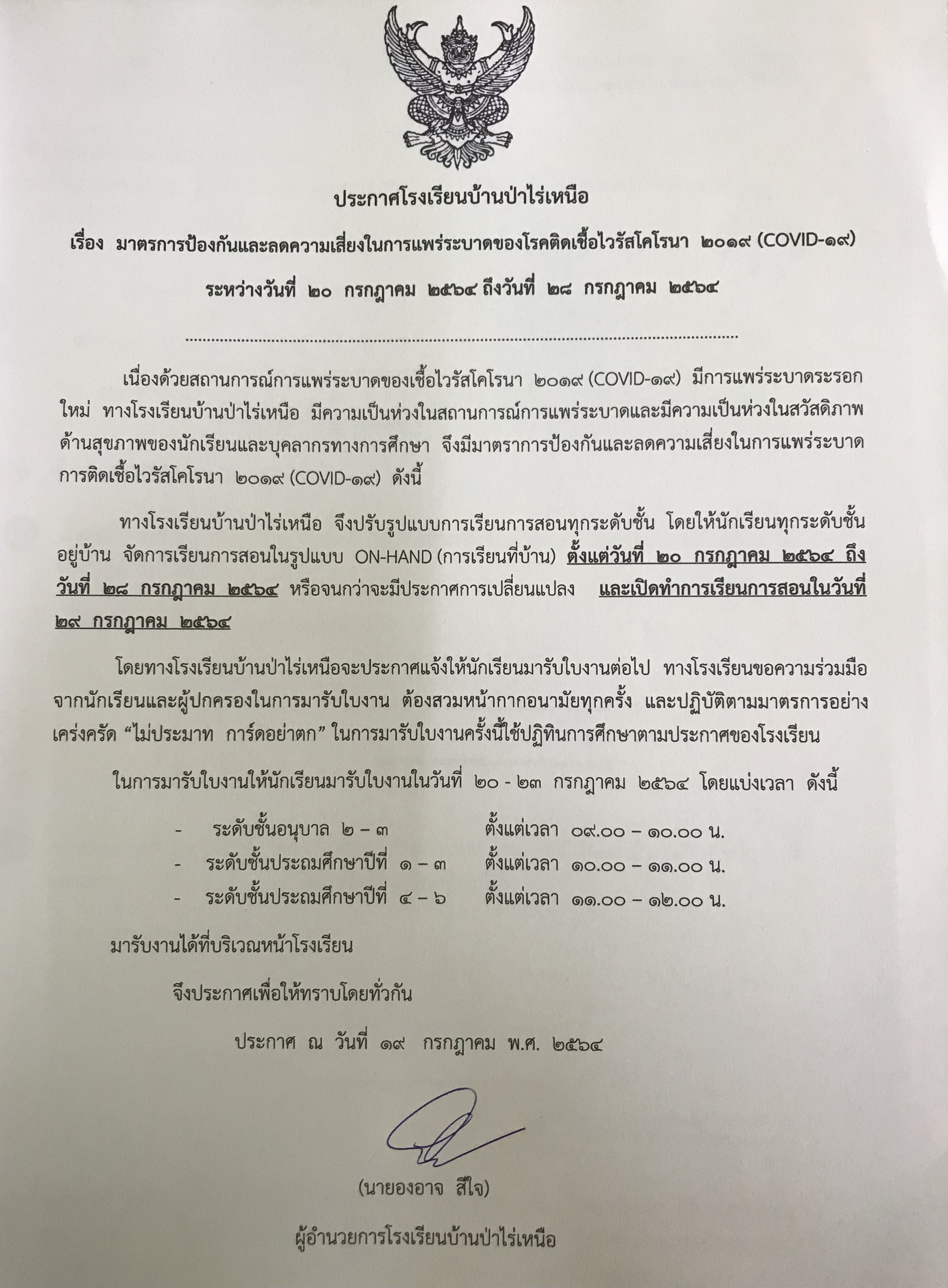 เพื่อลดความเสี่ยงในการแพร่ระบาดของโรคติดเชื้อไวรัสโคโรนา 2019 (COVID – 19) ทางโรงเรียนจึงขอปรับรูปแบบการเรียนการสอนในรูปแบบ ON-HAND ในระหว่างวันที่ 20 กรกฎาคม 2564 ถึงวันที่ 28 กรกฎาคม 2564 นี้ หรือจนกว่าจะมีประกาศเปลี่ยนแปลง