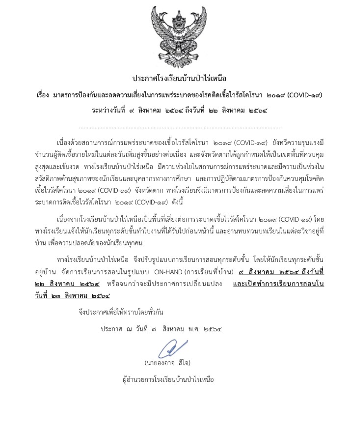 ประกาศเพื่อลดความเสี่ยงในการแพร่ระบาดของโรคติดเชื้อไวรัสโคโรนา 2019 (COVID – 19) ทางโรงเรียนจึงขอปรับรูปแบบการเรียนการสอนในรูปแบบ ON-HAND ในระหว่างวันที่ 9 สิงหาคม 2564 ถึงวันที่ 22 สิงหาคม 2564 และเปิดทำการเรียนการสอนในวันที่ 23 สิงหาคม 2564